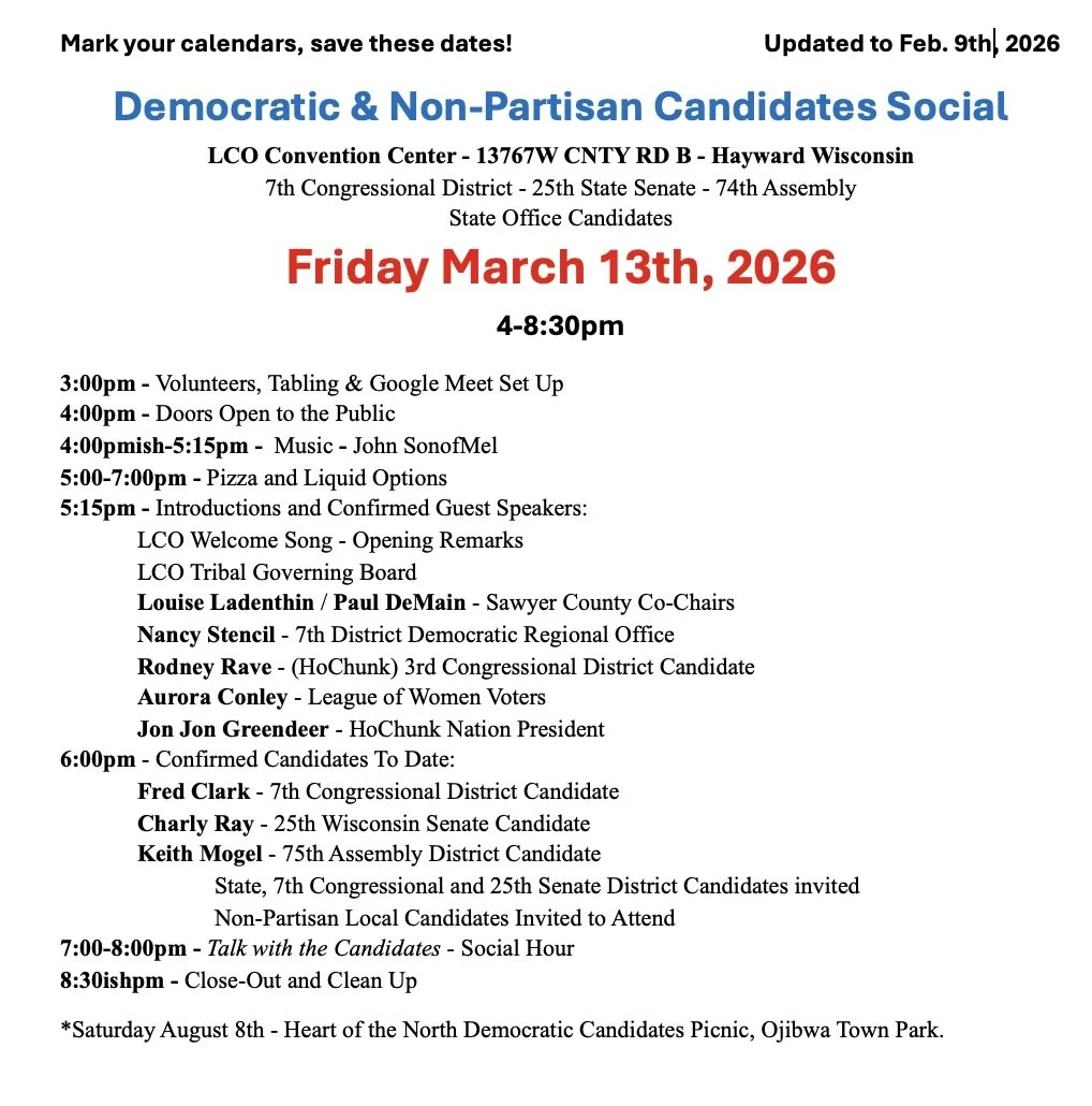 Please join us at the February 24, 2026 monthly meeting of the Sawyer County and LCO Democratic Party. Stop by for a social hour from 5:30 to 6:30 p.m.; stay for the business meeting from 6:30 p.m. to about 8 p.m. if you wish.