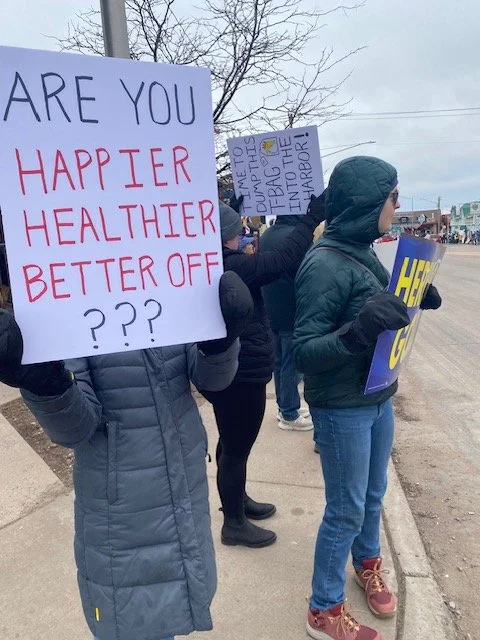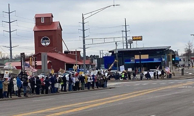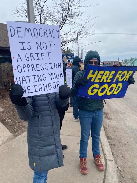 Participants gathered on the sidewalks of all four corners of U.S. 63 and Wisconsin 27 to express their support for democracy and rule of law and their opposition to the cruel, corrupt policies of the Trump administration.