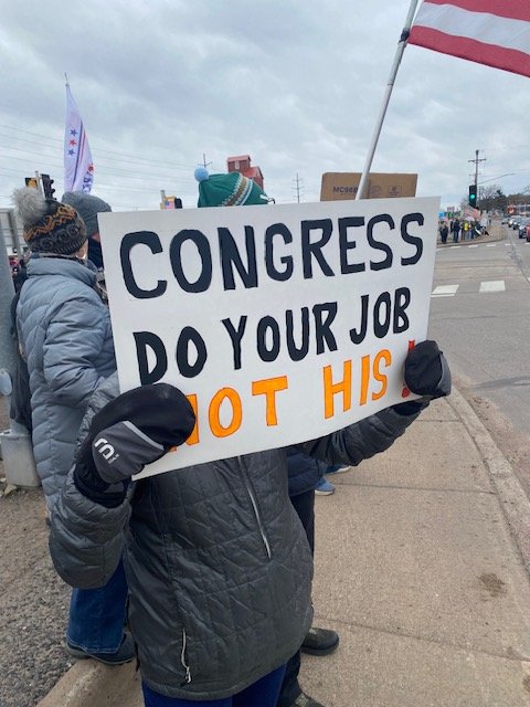 Besides signs and warm clothes, rallygoers brought the spirit of local activist Paul DeMain who, when asked why he was there, quipped “Because it’s such a perfect day to protect democracy.” The majority of passing motorists honked and waved in support of demonstrators.