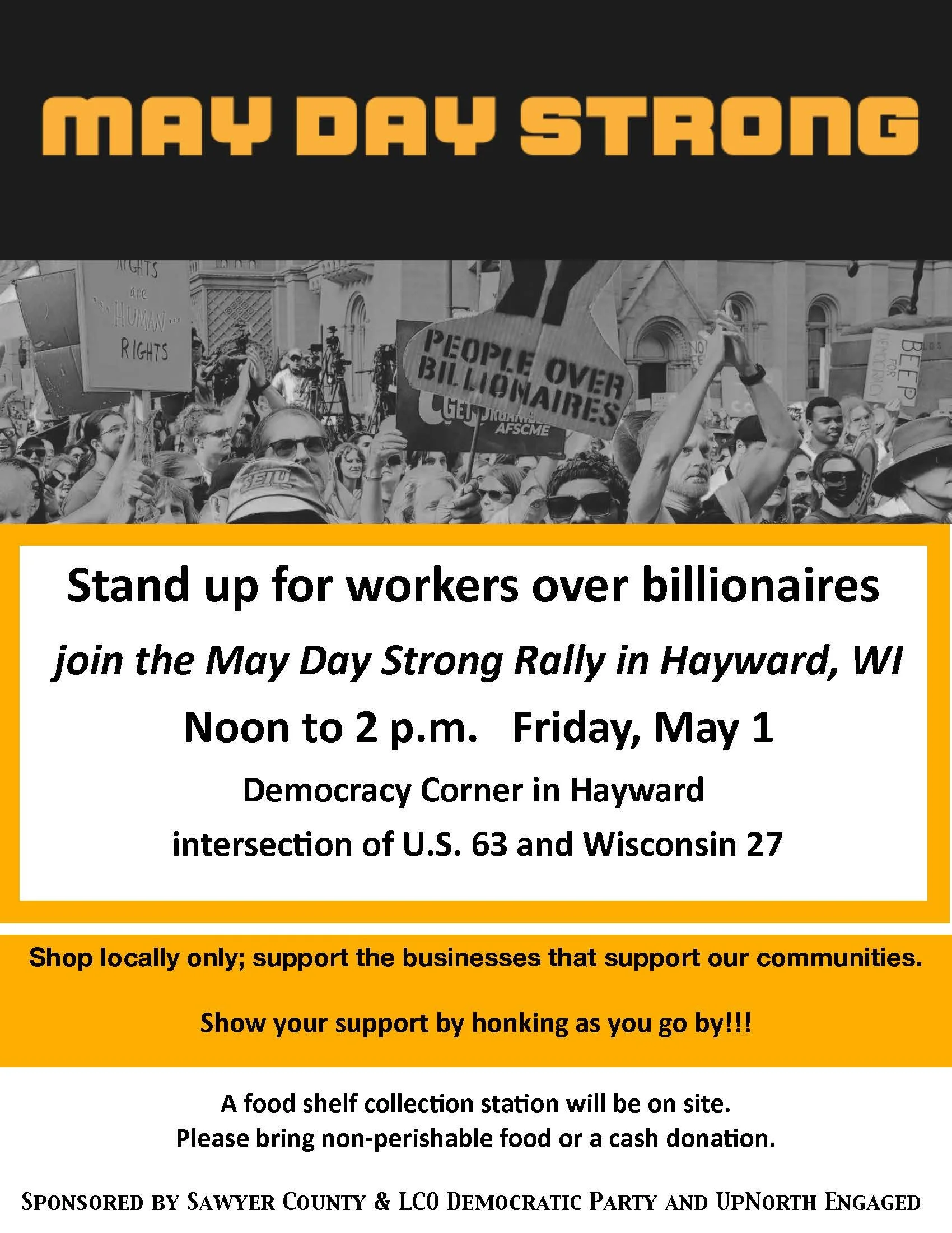 Stand up for workers over billionaires at a May Day Strong rally from noon to 2 p.m., Friday, May 1, on Democracy Corner in Hayward. That's the intersection of U.S. 63 and Wisconsin 27.